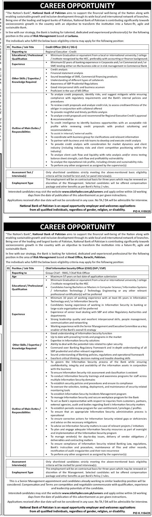 The National Bank of Pakistan (NBP), “The Nation’s Bank,” has announced career opportunities for talented, dedicated, and experienced professionals in its Risk Management division. The bank is seeking to fill two key positions: a senior leadership role of Chief Information Security Officer (CISO) based in Karachi, and a Credit Officer position based in Larkana.