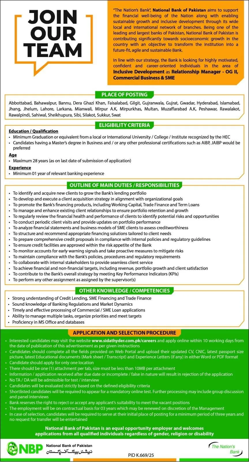 Pakistan – The National Bank of Pakistan (NBP), one of the nation’s largest and most prestigious financial institutions, has announced a major recruitment drive for talented and career-oriented individuals. In line with its strategy to foster inclusive development and socioeconomic growth, the bank is seeking to hire Relationship Managers (OG-II) for its Commercial Business & SME division.
