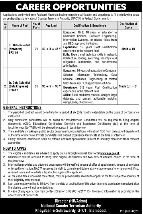 The National Counter Terrorism Authority (NACTA) has invited applications from qualified and experienced Pakistani nationals to fill two key data science positions on a contract basis. The authority is seeking to hire a Senior Data Scientist (Networks) and a Junior Data Scientist (Data Engineer).