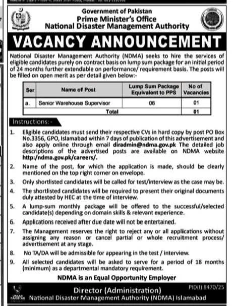 Keywords: NDMA Jobs 2025, National Disaster Management Authority Careers, Senior Warehouse Supervisor Jobs Islamabad, Govt Jobs in Islamabad 2025, Prime Minister Office Jobs Pakistan, Warehouse Management Vacancies, PPS-06 Jobs Pakistan.