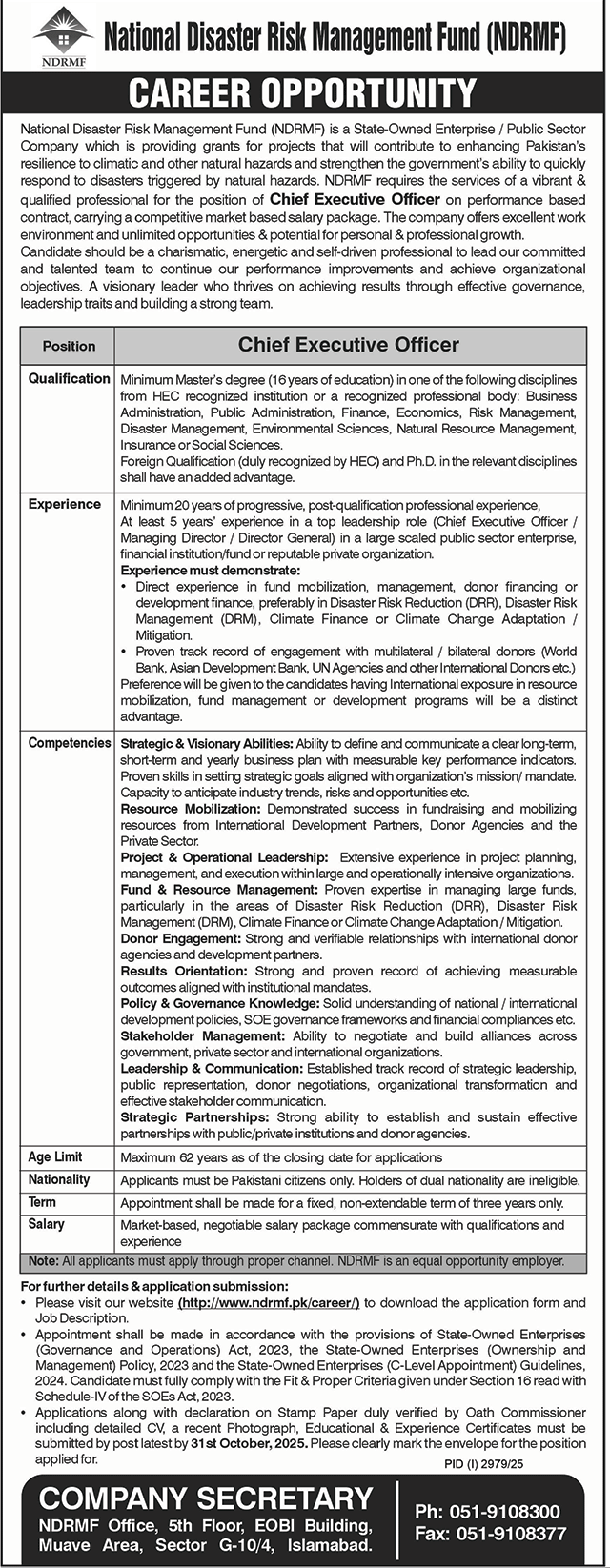 The National Disaster Risk Management Fund (NDRMF), a public sector company under the Government of Pakistan, has announced a career opportunity for the position of Chief Executive Officer (CEO). This is a highly competitive, performance-based post offering a market-based salary package with growth potential and professional development opportunities.
