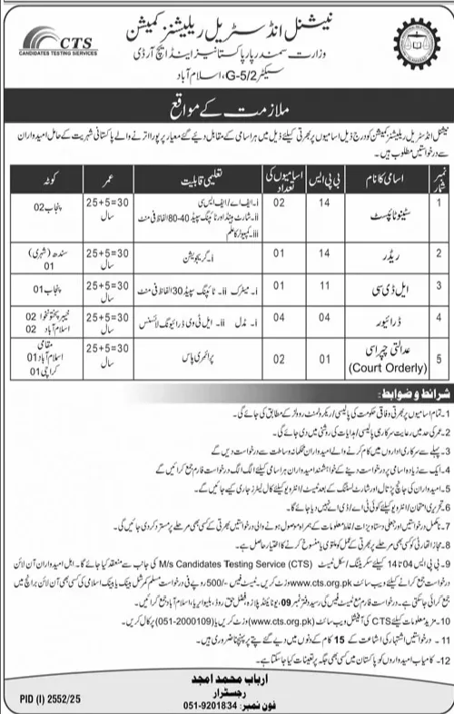 The National Industrial Relations Commission, under the Ministry of Overseas Pakistanis and Human Resource Development, has announced a range of employment opportunities for Pakistani nationals. The commission is seeking applications from qualified and eligible candidates to fill various positions on a merit-based system. The recruitment process will be facilitated by the Candidates Testing Service (CTS).