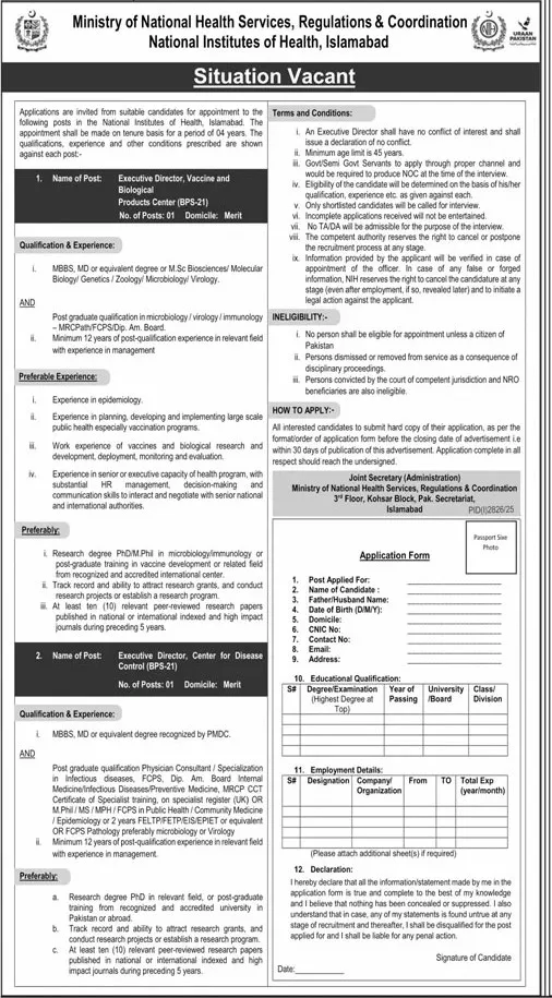 The Ministry of National Health Services, Regulations & Coordination has invited applications from suitable candidates for two high-profile Executive Director positions at the National Institutes of Health (NIH) in Islamabad. The appointments will be made on a tenure basis for a period of 04 years.