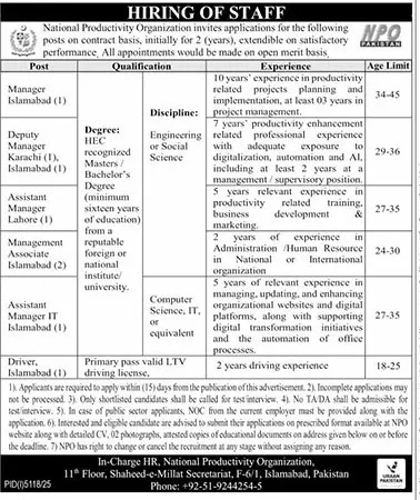 The National Productivity Organization (NPO) Hiring of Staff 2026 offers a valuable opportunity for professionals seeking a stable, impactful, and growth-oriented career in the public sector. With positions ranging from Manager to Driver, NPO welcomes candidates from diverse academic and professional backgrounds.