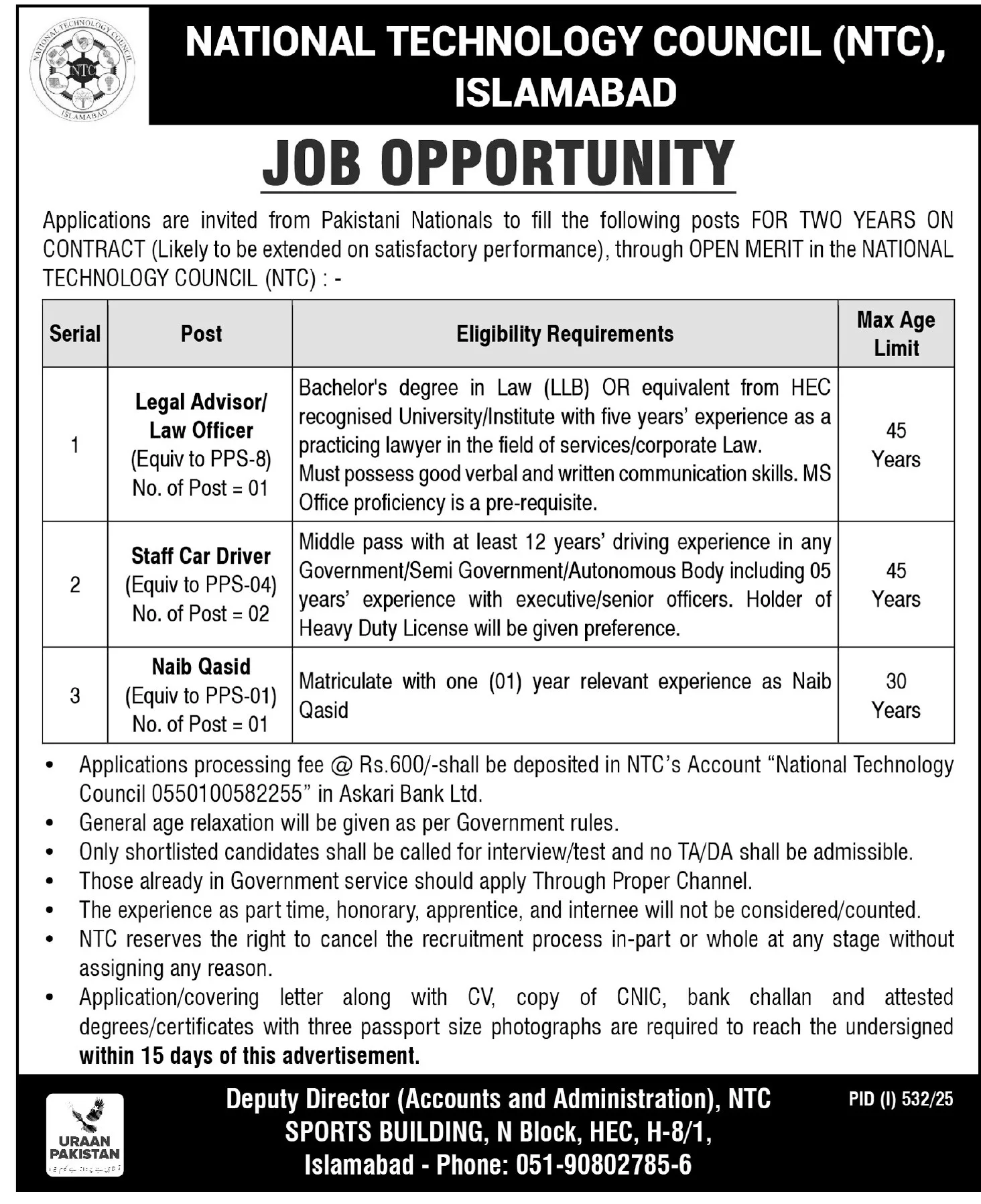 Keywords Recap: NTC jobs 2025, Legal Advisor PPS-8 Islamabad, Government driver jobs, Naib Qasid federal position, Technology council careers Pakistan.