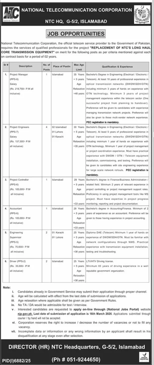 The National Telecommunication Corporation (NTC), the official telecom service provider for the Government of Pakistan, has announced several high-tier job openings. These positions are for the project titled “Replacement of NTC’s Long Haul Core Transmission Equipment” and are offered on a contract basis for a period of two years.