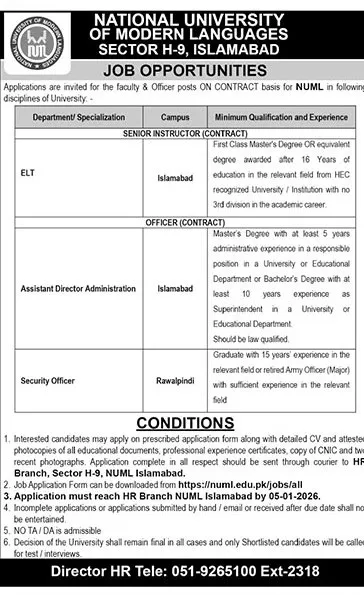 - All applications must be sent to the HR Branch, Sector H-9, NUML Islamabad by 05-01-2026.