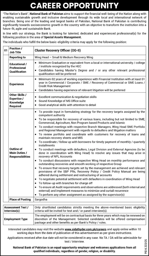 This recruitment aligns with NBP’s objective to transform into a future-fit, agile, and sustainable bank. The Cluster Recovery Officer position is critical in managing NBP’s non-performing assets, a key challenge for financial institutions globally. By targeting candidates with litigation experience and analytical skills, NBP aims to enhance its recovery mechanisms, reduce financial risks, and support economic growth across Pakistan.