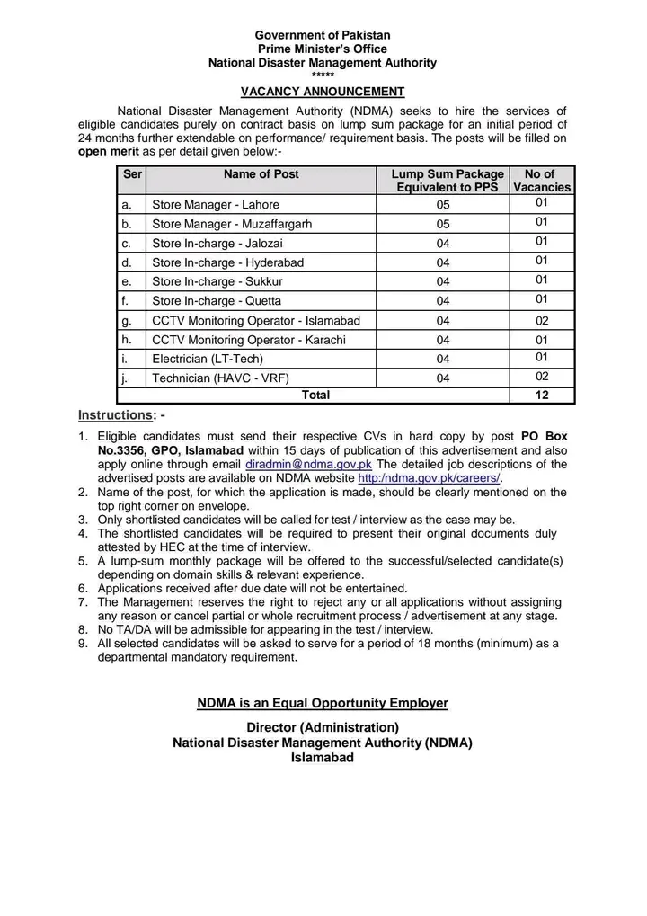 The National Disaster Management Authority (NDMA), operating under the Prime Minister’s Office, Government of Pakistan, has announced a recruitment drive for highly eligible candidates. NDMA is seeking to hire individuals purely on a contract basis with a Lump Sum Package for an initial period of 24 months, further extendable based on performance and departmental requirements.