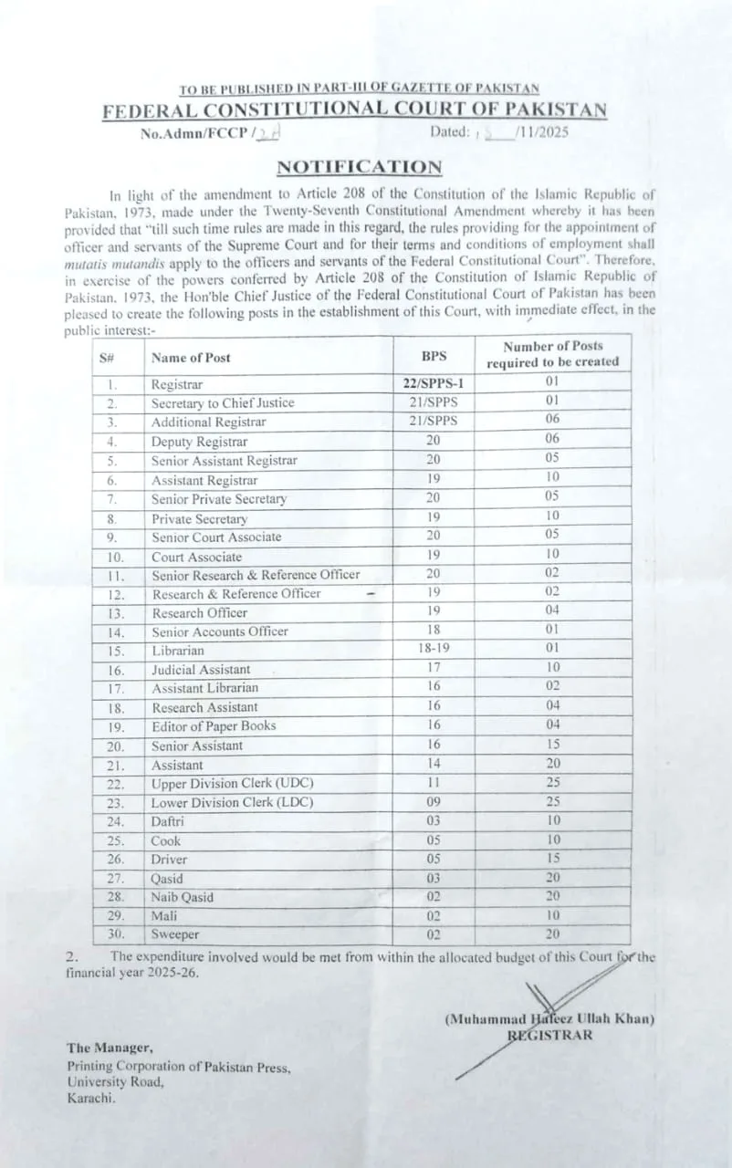 The Federal Constitutional Court of Pakistan (FCC) has issued a significant Notification regarding the creation of a large number of posts across its establishment. This decision, dated 12/11/2025, has been made following the amendment to Article 208 of the Constitution of the Islamic Republic of Pakistan, 1973, allowing the rules of the Supreme Court to apply to the officers and servants of the Federal Constitutional Court.