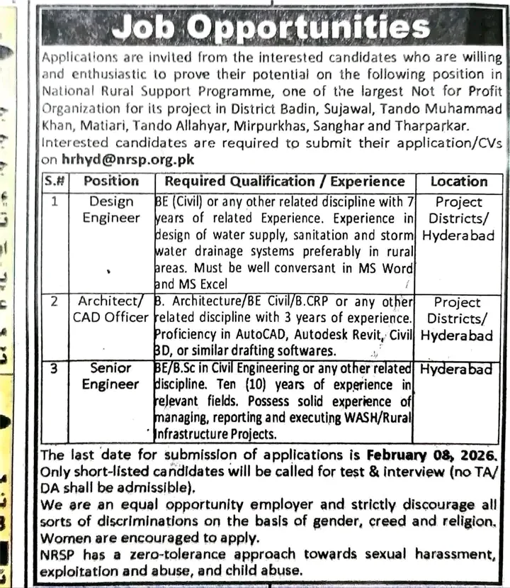 Keywords: NRSP Jobs 2026, Civil Engineering Jobs Sindh, NGO Careers Pakistan, Rural Development Infrastructure, WASH Project Jobs, NRSP Hyderabad Recruitment, Senior Engineer Jobs Sindh, AutoCAD Officer Vacancies.