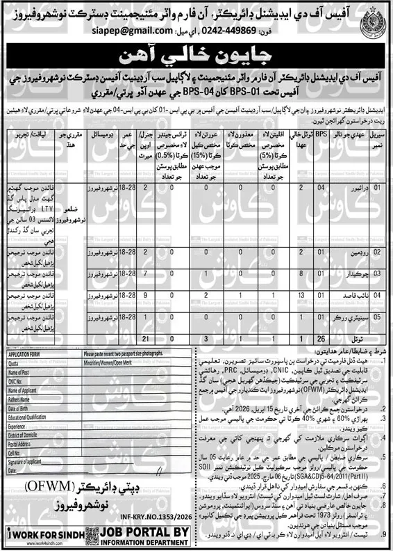 Keywords: OFWM Naushahro Feroze Jobs 2026, On-Farm Water Management Vacancies, Sindh Agriculture Department Jobs, Govt Jobs in Naushahro Feroze, Driver Jobs Sindh 2026, Naib Qasid Vacancies Sindh, Government Jobs for Middle Pass.