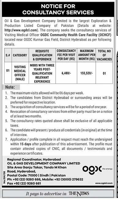 The Oil & Gas Development Company Limited (OGDCL), Pakistan’s largest Exploration and Production company, has announced a consultancy opportunity for a medical professional. The company is seeking the services of a Visiting Medical Officer (Male) for its OGDCL Community Health Care Facility (OCHCF), located near the OGDCL Kunnar Gas Field in District Hyderabad.
