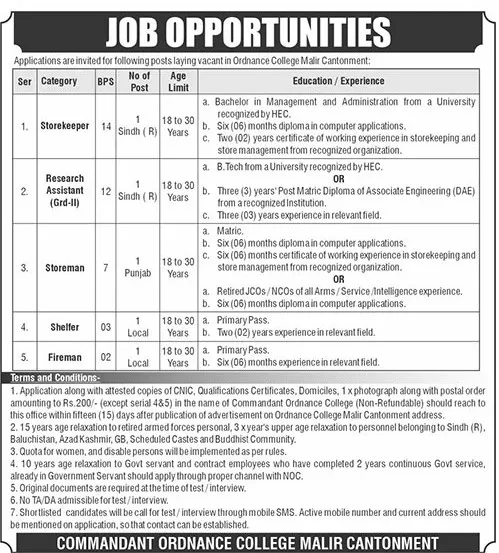 Ordnance College Malir Cantonment Jobs 2026 – Apply Now for Storekeeper, Research Assistant, Shelter and Fireman Posts