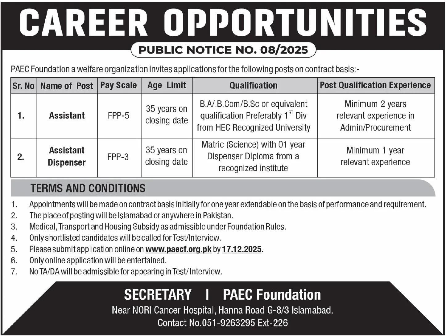 PAEC Foundation Jobs 2025 – Apply Online for Assistant & Assistant Dispenser | Public Notice No. 08/2025