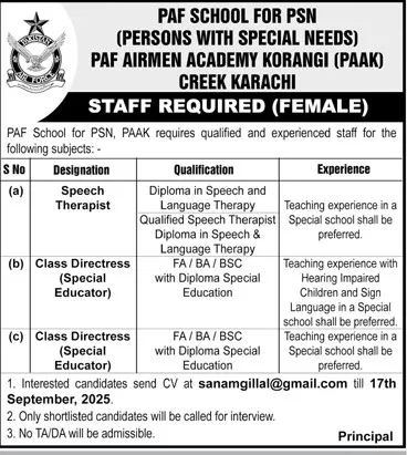 The PAF School for Persons with Special Needs (PSN), located at the PAF Airmen Academy Korangi (PAAK) in Creek, Karachi, is inviting applications from qualified and experienced female professionals for several key positions. The school is seeking dedicated individuals to join its team and contribute to the education and development of students with special needs.