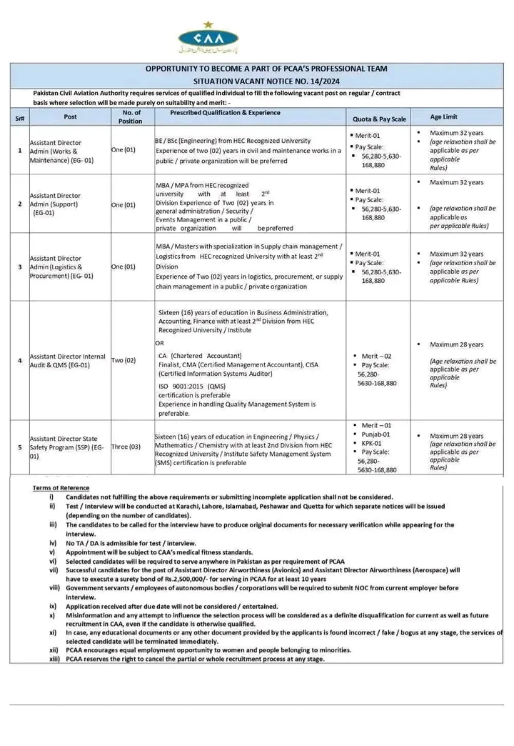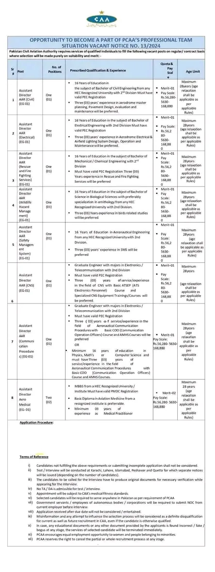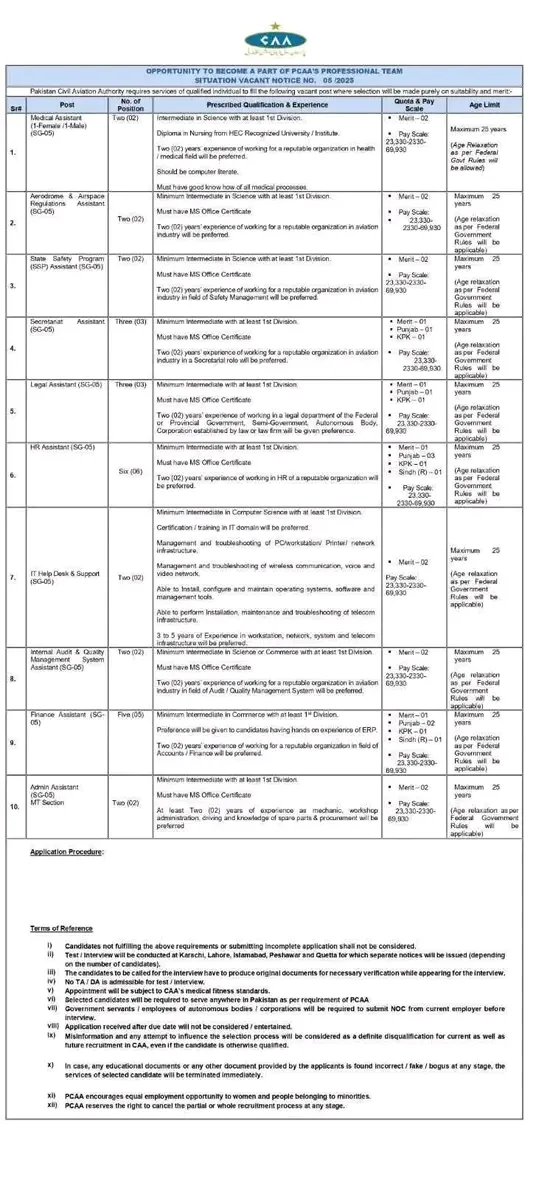 The Pakistan Civil Aviation Authority (PCAA) has announced a significant recruitment drive, inviting applications from qualified and experienced professionals to join its dynamic team. The authority has opened a wide range of vacancies on a regular/contract basis across various departments, including engineering, administration, safety, IT, and other support services.