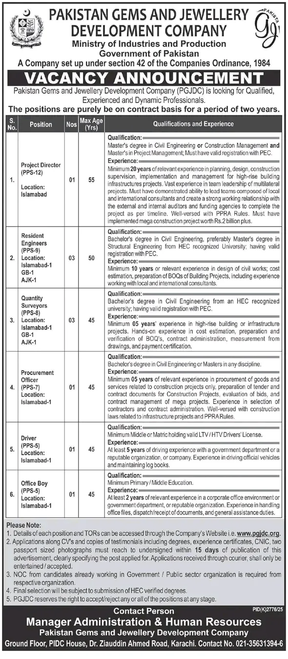 The Pakistan Gems and Jewellery Development Company (PGJDC), a subsidiary of the Ministry of Industries and Production, Government of Pakistan, is looking for experienced and dynamic professionals to fill several technical and administrative vacancies. These positions are offered on a contract basis for two years and are located across Islamabad, Gilgit-Baltistan (GB), and Azad Jammu and Kashmir (AJK).