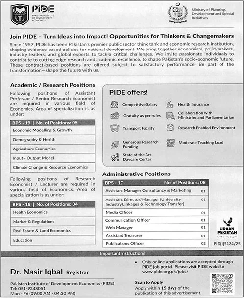 This recruitment drive is aimed at individuals who want to turn ideas into impact by contributing to evidence-based research, economic policy development, and socio-economic transformation of Pakistan. These positions are offered on a contract basis, extendable subject to satisfactory performance.