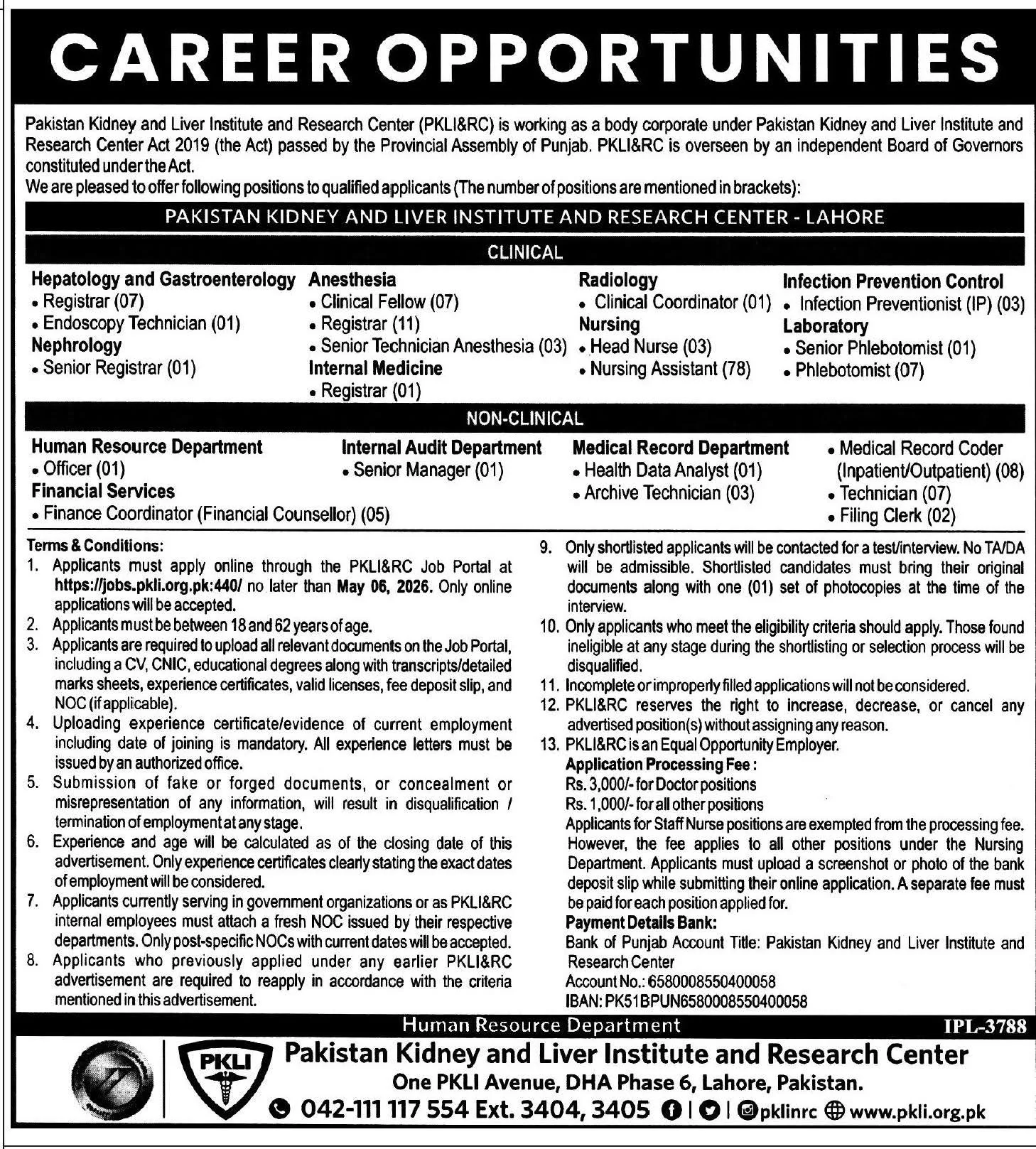 Keywords: PKLI Jobs 2026, Pakistan Kidney and Liver Institute Careers, Medical Jobs in Lahore, Nursing Assistant Vacancies Lahore, Registrar Anesthesia Jobs, Hospital Administrative Jobs Pakistan, PKLI Online Application Portal.