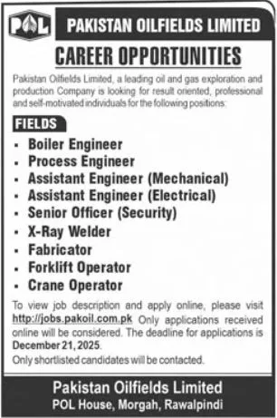 Pakistan Oilfields Limited (POL), a leading oil and gas exploration and production company of Pakistan, has announced career opportunities for skilled, qualified, and experienced professionals at its operations in Rawalpindi. These positions offer excellent growth prospects in a reputable energy sector organization.