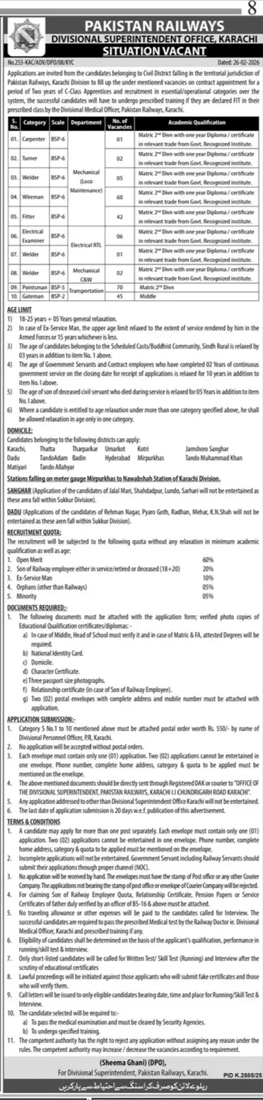 The Pakistan Railways (Karachi Division) has officially announced a massive recruitment drive for C-Class Apprentices and essential operational staff. These positions are being offered on a contract basis for an initial period of two years. With vacancies ranging from BPS-02 to BPS-06, this is an ideal opportunity for matric and middle-pass candidates residing in the Karachi and Hyderabad regions.
