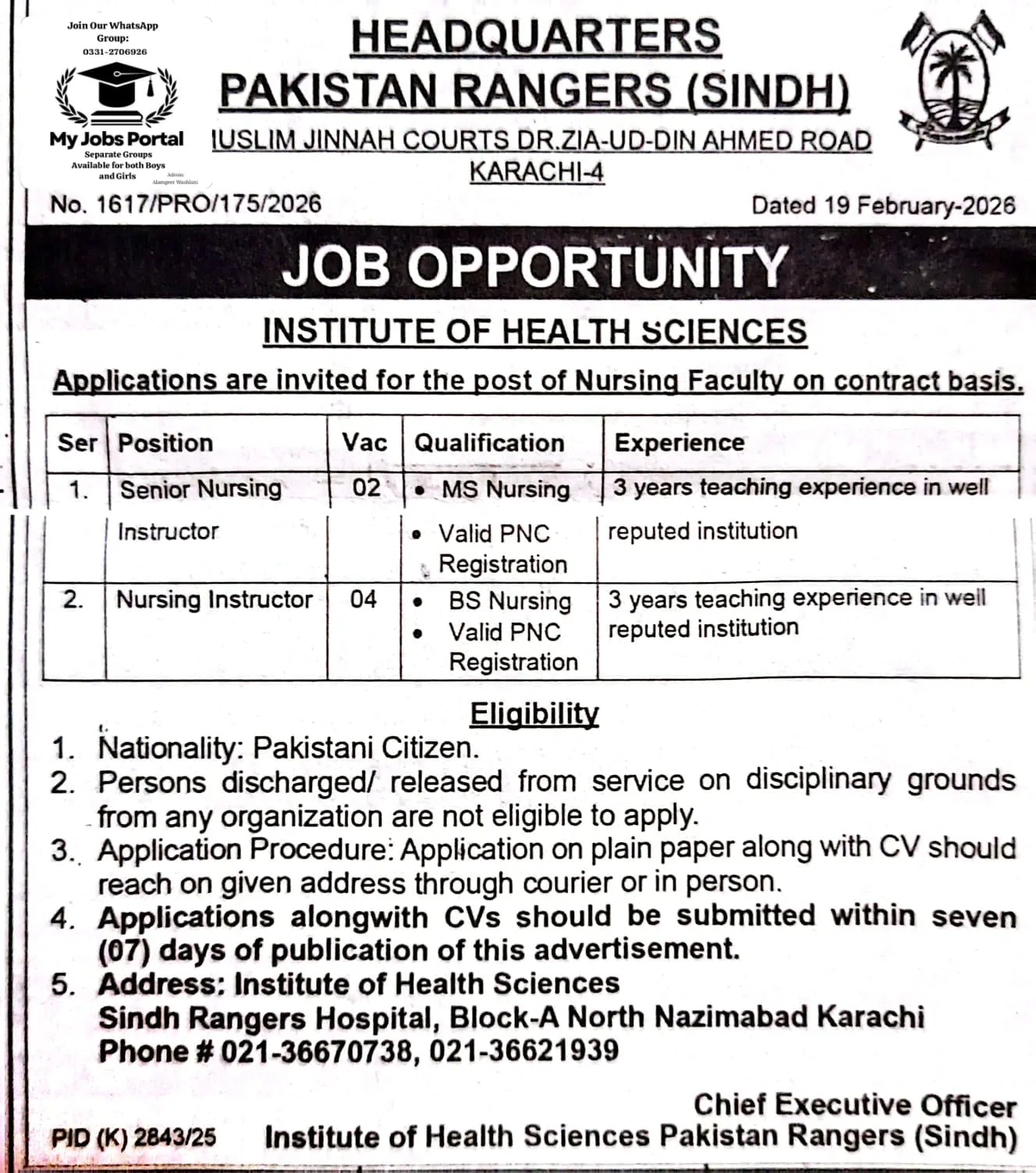 Authorized Authority: Chief Executive Officer, Institute of Health Sciences Pakistan Rangers (Sindh).