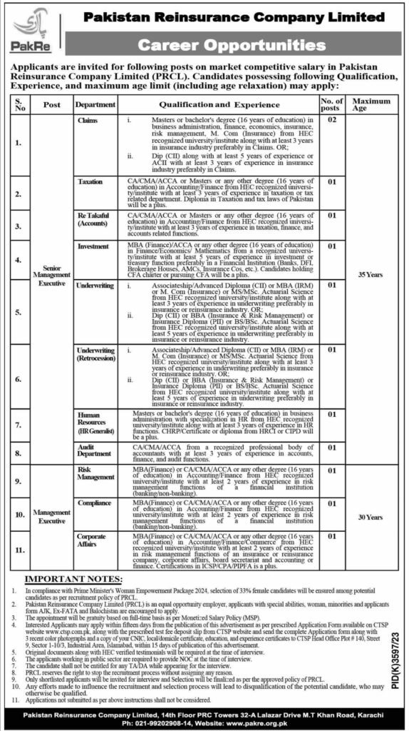 Pakistan Reinsurance Company Limited (PakRe) offers a range of exciting career opportunities across various departments. With a focus on professional growth and development, PakRe is an excellent place for talented individuals to build their careers. If you meet the qualifications and experience requirements, we encourage you to apply and become a part of this prestigious organization.