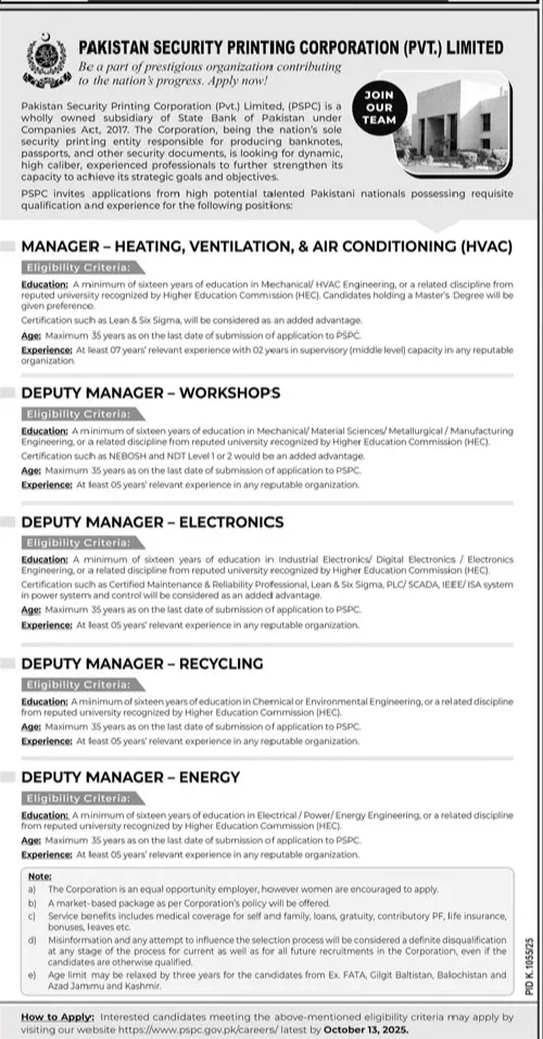 Pakistan Security Printing Corporation (Pvt.) Limited Seeks High-Caliber Professionals for Key Managerial Roles
