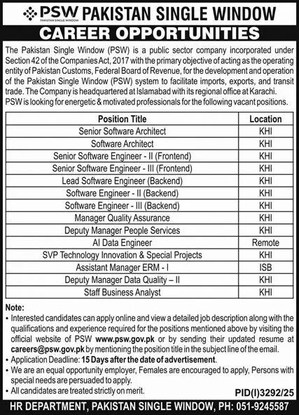 The Pakistan Single Window (PSW), a public sector company incorporated under the Companies Act, 2017, has invited applications from energetic and motivated professionals for a wide range of vacant positions. The company is seeking to fill numerous roles in its software development, data, and management teams.