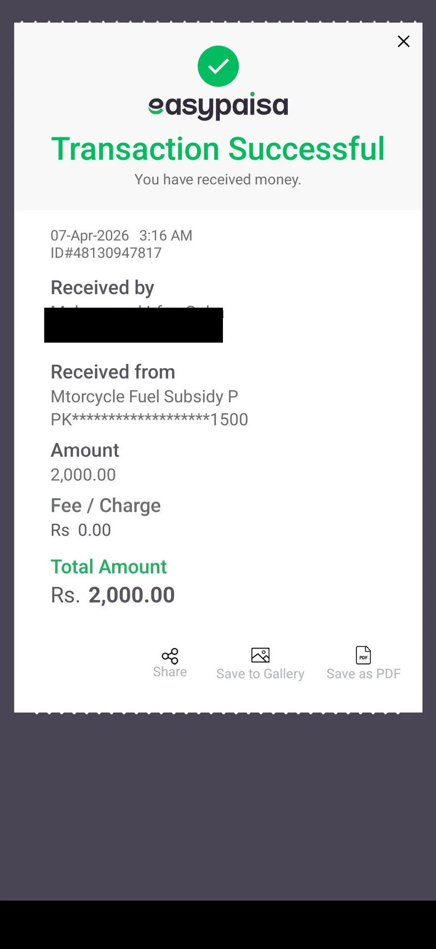 “Aap petrol subsidy ke liye ehal hain aur apki raqam muntakil kardi gai hai.” (You are eligible and funds are transferred).