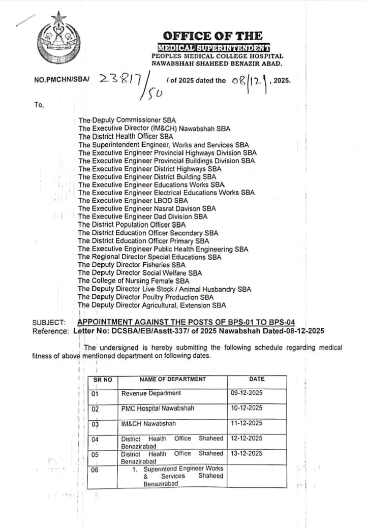 The Office of the Medical Superintendent, Peoples Medical College Hospital (PMCH), Nawabshah (Shaheed Benazirabad), has issued an urgent schedule for the medical fitness test of candidates selected for appointments to positions in BPS-01 to BPS-04.