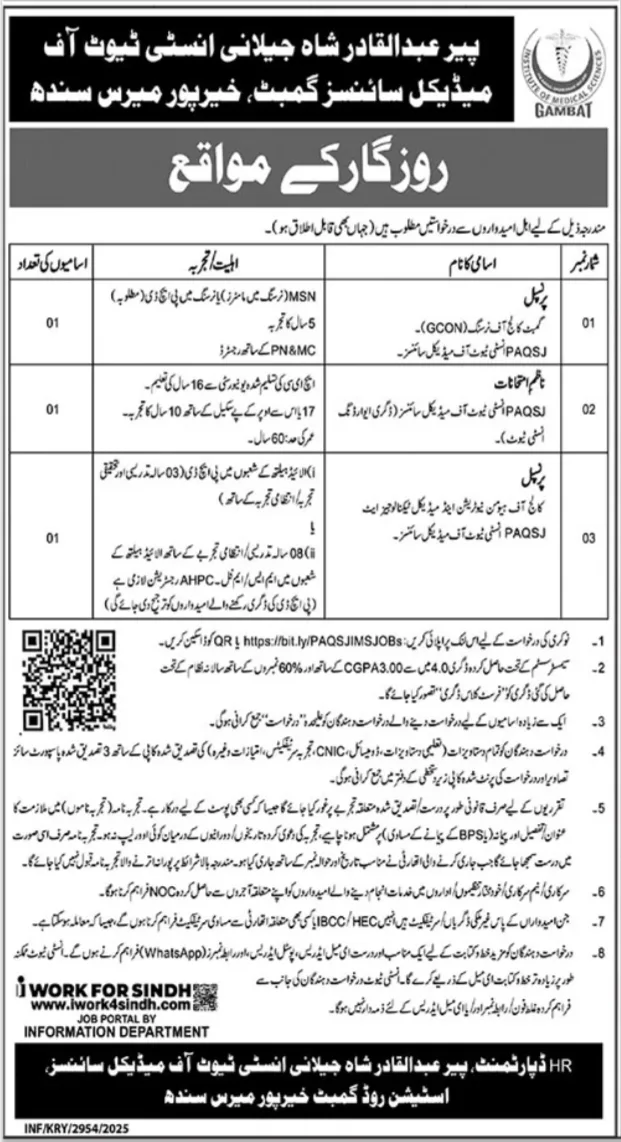 The job openings at Pir Abdul Qadir Shah Jeelani Institute of Medical Sciences, Gambat (PAQSJIMS) represent a golden opportunity for experienced professionals in nursing, physiotherapy, and allied health sciences. These positions are not just about securing employment; they are about contributing to the growth of medical education in Sindh and making a lasting impact on the healthcare sector of Pakistan.