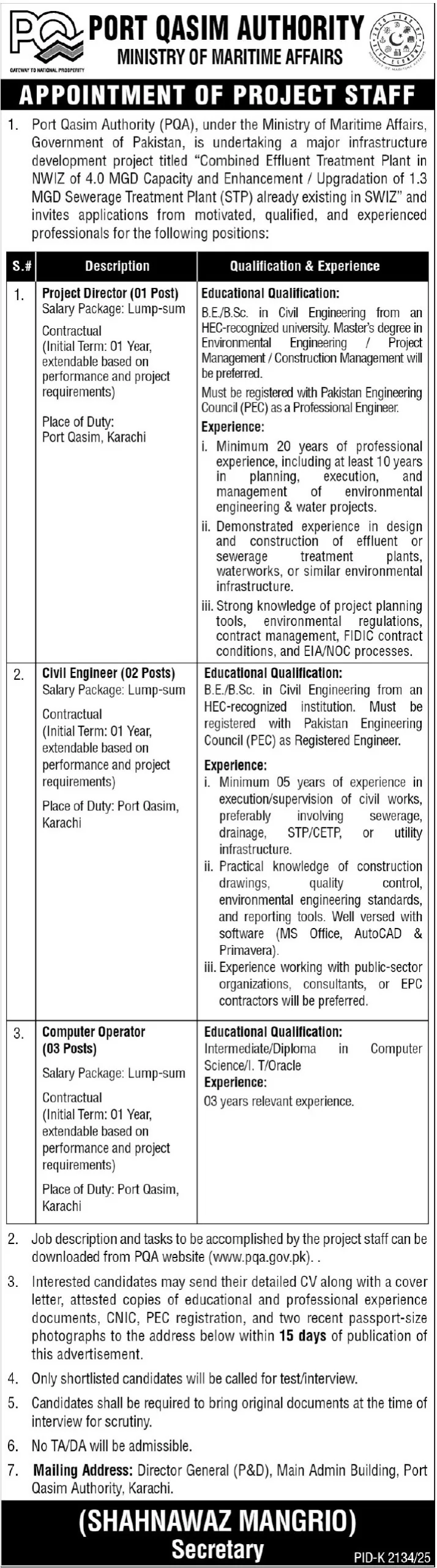 This recruitment drive is part of an important environmental and infrastructure project titled “Combined Effluent Treatment Plant in NWIZ of 4.0 MGD Capacity and Enhancement/Upgradation of 1.3 MGD Sewerage Treatment Plant (STP) already existing in SWIZ.” The project aims to improve wastewater management, environmental compliance, and sustainable industrial development at Port Qasim.