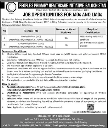 The People’s Primary Healthcare Initiative (PPHI) Balochistan has officially announced multiple new job openings for Medical Officers (MOs) and Lady Medical Officers (LMOs). These vacancies are being filled on a temporary basis for various districts across Balochistan, except the Quetta district for LMO positions.