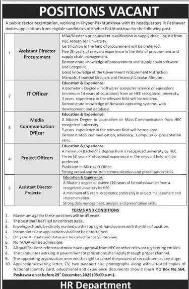 A well-reputed public sector organization in Khyber Pakhtunkhwa (KP) has announced multiple Positions Vacant 2026 for qualified, experienced, and motivated professionals. These government jobs in Pakistan 2026 are based in Peshawar, offering an excellent opportunity for individuals seeking secure public sector employment in 2026.