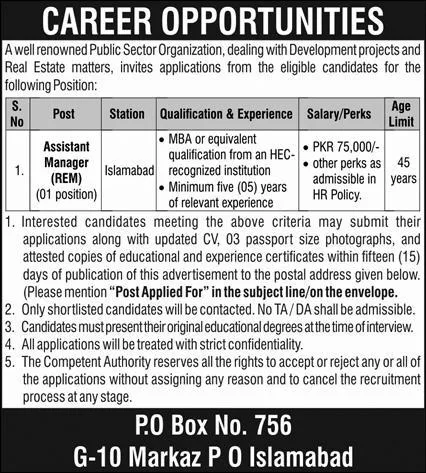 Are you a seasoned management professional looking for a stable and high-paying career in the public sector? A well-renowned Public Sector Organization in Islamabad, specializing in development projects and real estate matters, has officially announced a vacancy for the position of Assistant Manager (REM).
