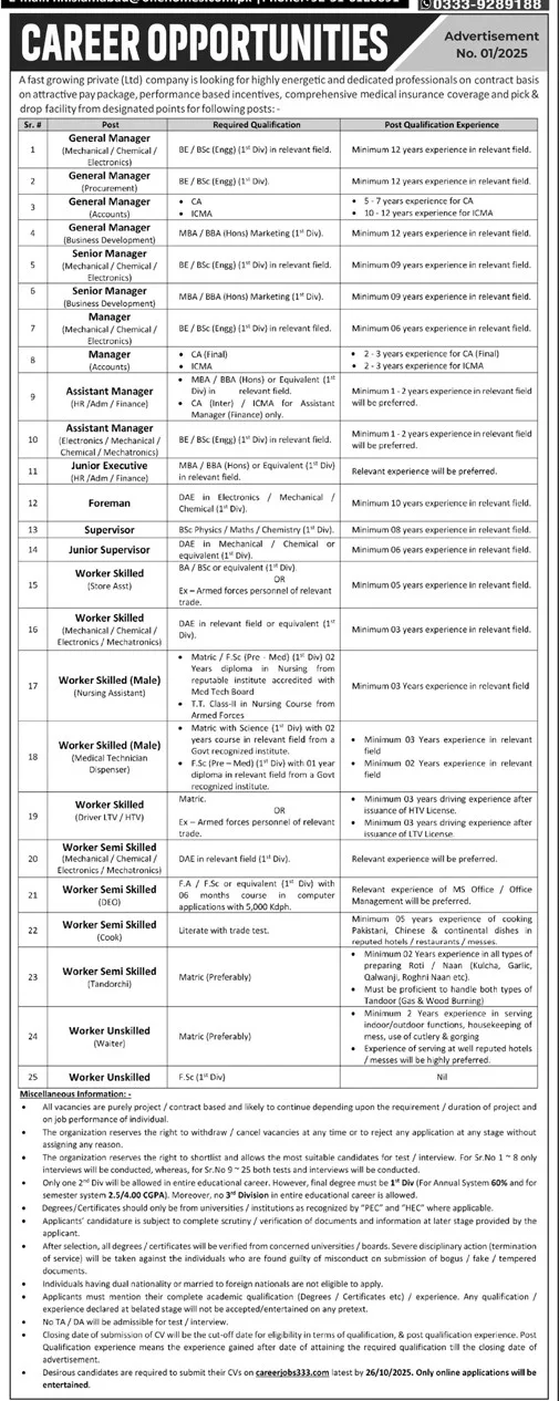 The company has openings ranging from senior management to unskilled worker levels. Below is a comprehensive list of the available posts along with their required qualifications and experience.