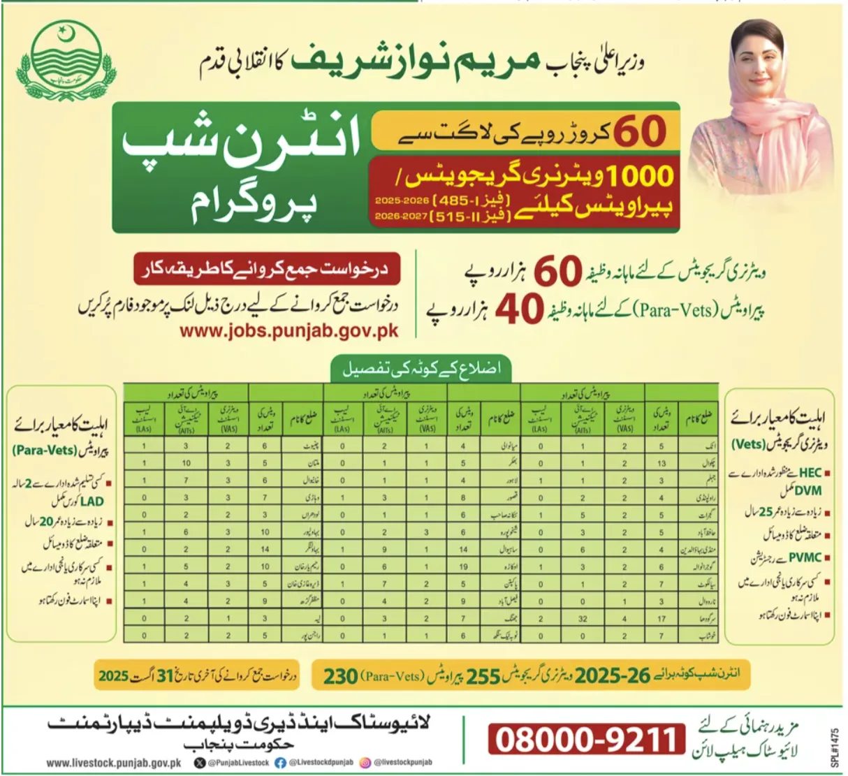 The Government of Punjab under the leadership of Chief Minister Maryam Nawaz Sharif has launched a historic initiative to promote the livestock sector and create career opportunities for young professionals. The Punjab Livestock & Dairy Development Internship Program 2025 is one of the largest government-supported internship schemes in Pakistan’s history, offering 1,000 paid internship positions for both Veterinary Graduates (Vets) and Para-Veterinary Diploma Holders (Para-Vets).