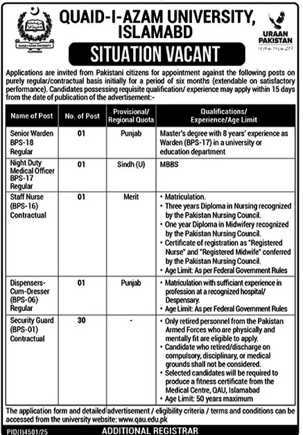 Quaid-i-Azam University (QAU), Islamabad, a leading institution for higher education and research, has announced a significant recruitment drive for staff positions on both regular and contractual bases. This provides immediate and long-term government job opportunities for qualified professionals seeking careers in a prestigious federal university environment. The university is specifically targeting experienced personnel for key roles in administration, medical services, and security.