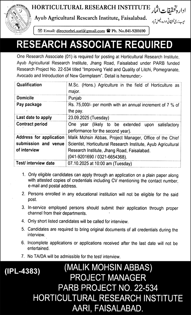Horticultural Research Institute Faisalabad is hiring a Research Associate for a litchi & pomegranate project. MSc (Hons) Horticulture required. Apply by September 23, 2025.