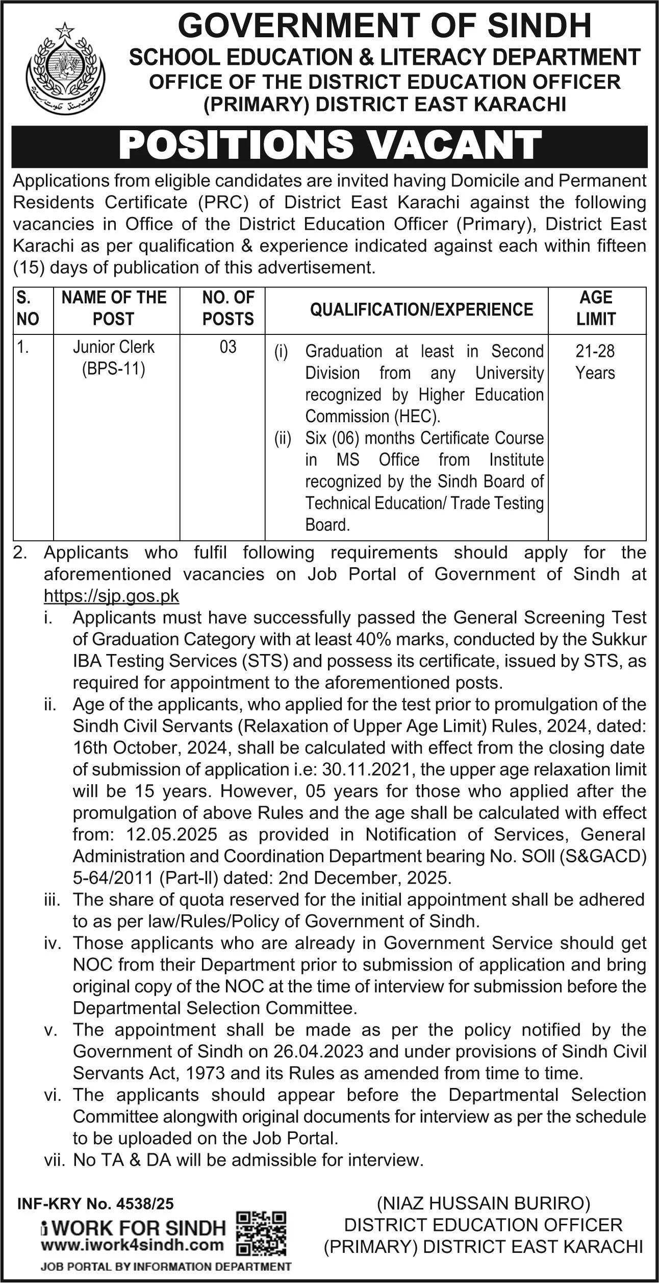 Only candidates with District East Karachi domicile and PRC are eligible. Incomplete applications or those submitted after the due date will be rejected. Selection will be made strictly on merit and transparency.