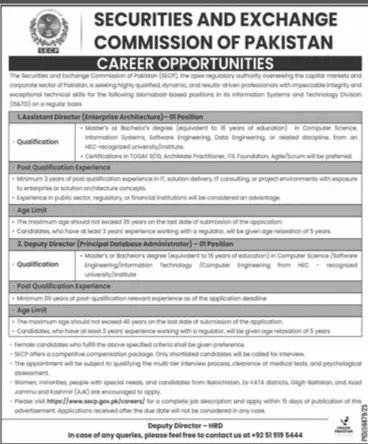 The Securities and Exchange Commission of Pakistan (SECP), the premier regulatory body for capital markets and the corporate sector, is seeking highly qualified, dynamic, and results-driven professionals. These regular, Islamabad-based positions are within the Information Systems and Technology Division (IS&TD).