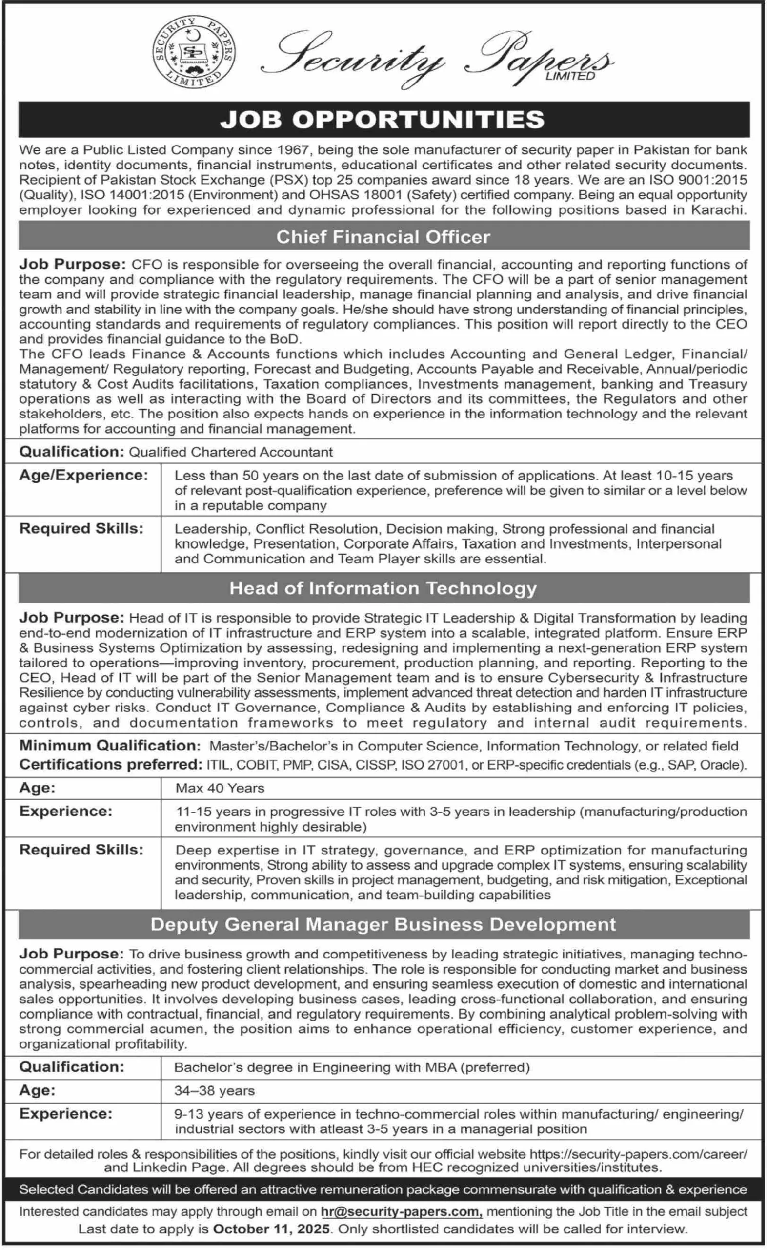 As an equal opportunity employer, Security Papers Limited is looking for talented individuals to join its team based in Karachi. The open positions are for Chief Financial Officer, Head of Information Technology, and Deputy General Manager Business Development. The deadline for applications is October 11, 2025.