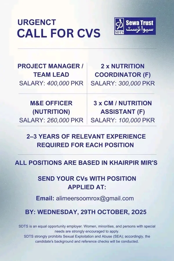 Sewa Trust (SDTS), a prominent non-governmental organization, has issued an urgent call for CVs for several high-paying, project-based positions in the field of nutrition. All positions are based in Khairpur Mir’s and offer a unique opportunity for experienced professionals to contribute to a vital community health initiative.