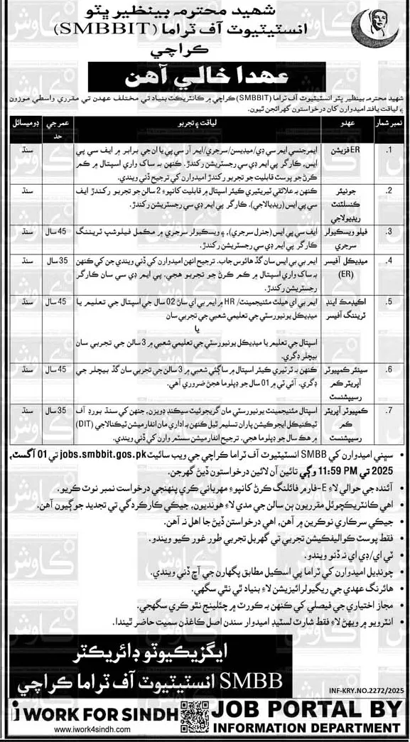 Interested candidates to submit their applications online through the official website of the Shaheed Mohtarma Benazir Bhutto Institute of Trauma, Karachi. The deadline for online applications is 11:59 PM on August 1, 2025.