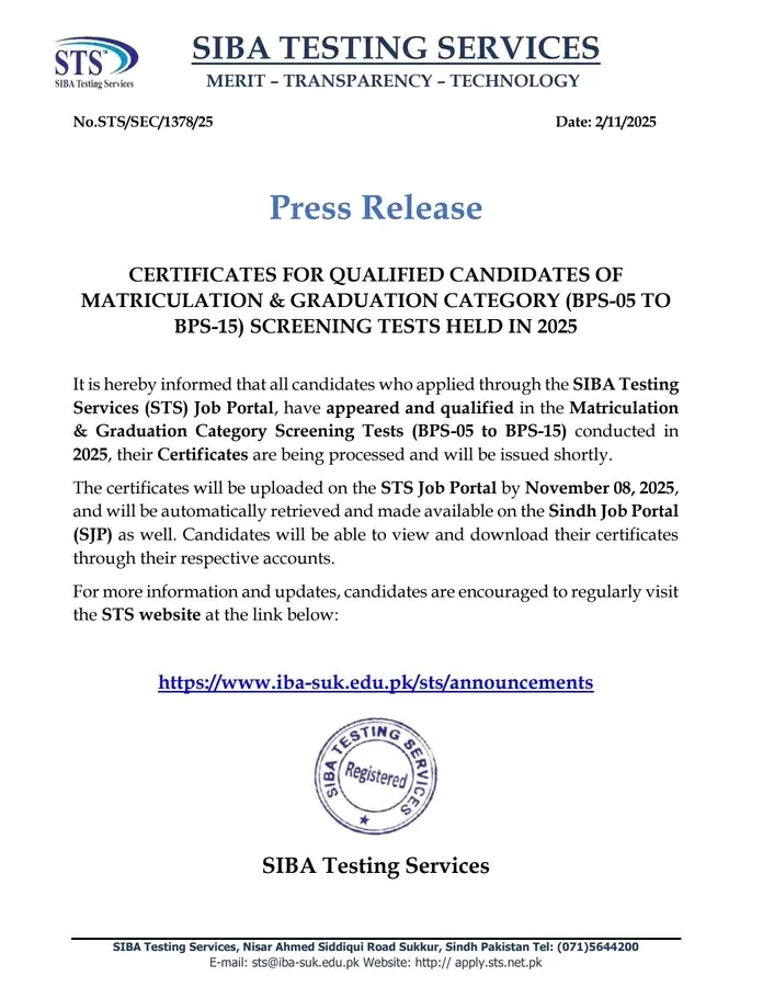 SIBA Testing Services (STS) has officially released the certificates for qualified candidates who appeared in the Matriculation & Graduation Category (BPS-05 to BPS-15) Screening Tests conducted in 2025. This much-anticipated announcement brings good news to thousands of applicants eagerly awaiting the next step in their career journey.