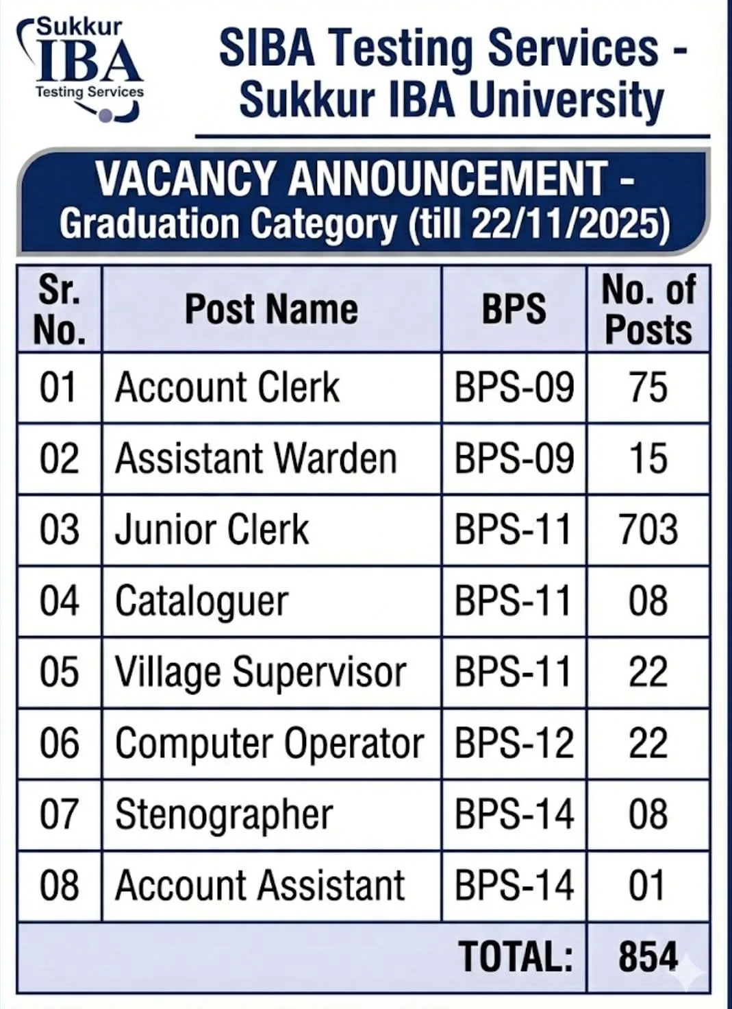 The SIBA Testing Services Sukkur IBA University Jobs 2025 – Graduation Category announcement is a major employment opportunity for graduates across Sindh. With 854 total positions across BPS-09 to BPS-14, this recruitment drive provides career growth, job security, and merit-based selection. The postings such as Junior Clerk, Account Clerk, Computer Operator, Stenographer, Assistant Warden, and Village Supervisor are highly suitable for young graduates seeking government employment.