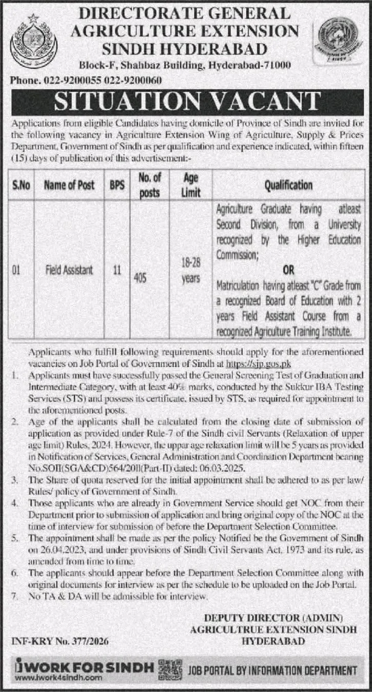 The Agriculture, Supply & Prices Department, Government of Sindh, has officially announced 405 vacant positions for the post of Field Assistant (BPS-11). This recruitment is being conducted through the Directorate General Agriculture Extension Sindh, Hyderabad, and is open to candidates holding a domicile in any district of Sindh province.