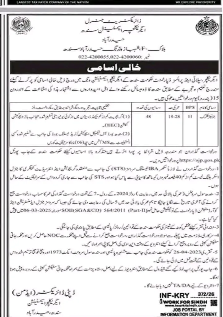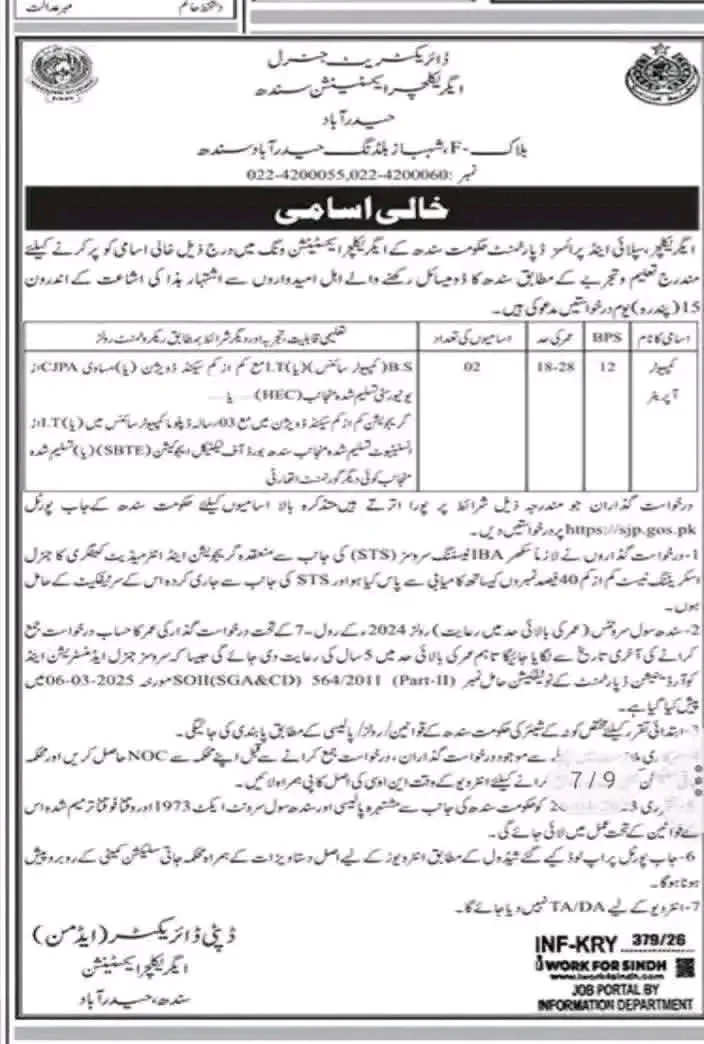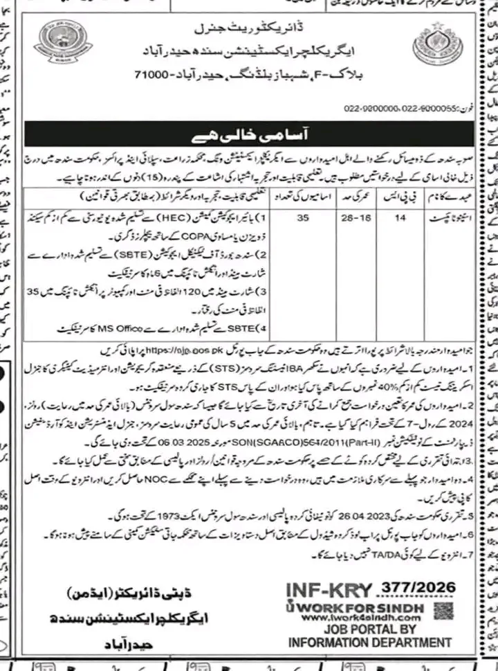 The Directorate General of Agriculture Extension Sindh, Hyderabad, has officially launched a major recruitment drive for 2026. This announcement, under the Agriculture Supply and Prices Department, opens up dozens of career opportunities for residents of Sindh holding a valid domicile.The latest positions range from BPS-11 to BPS-14, catering to graduates with administrative and technical expertise.